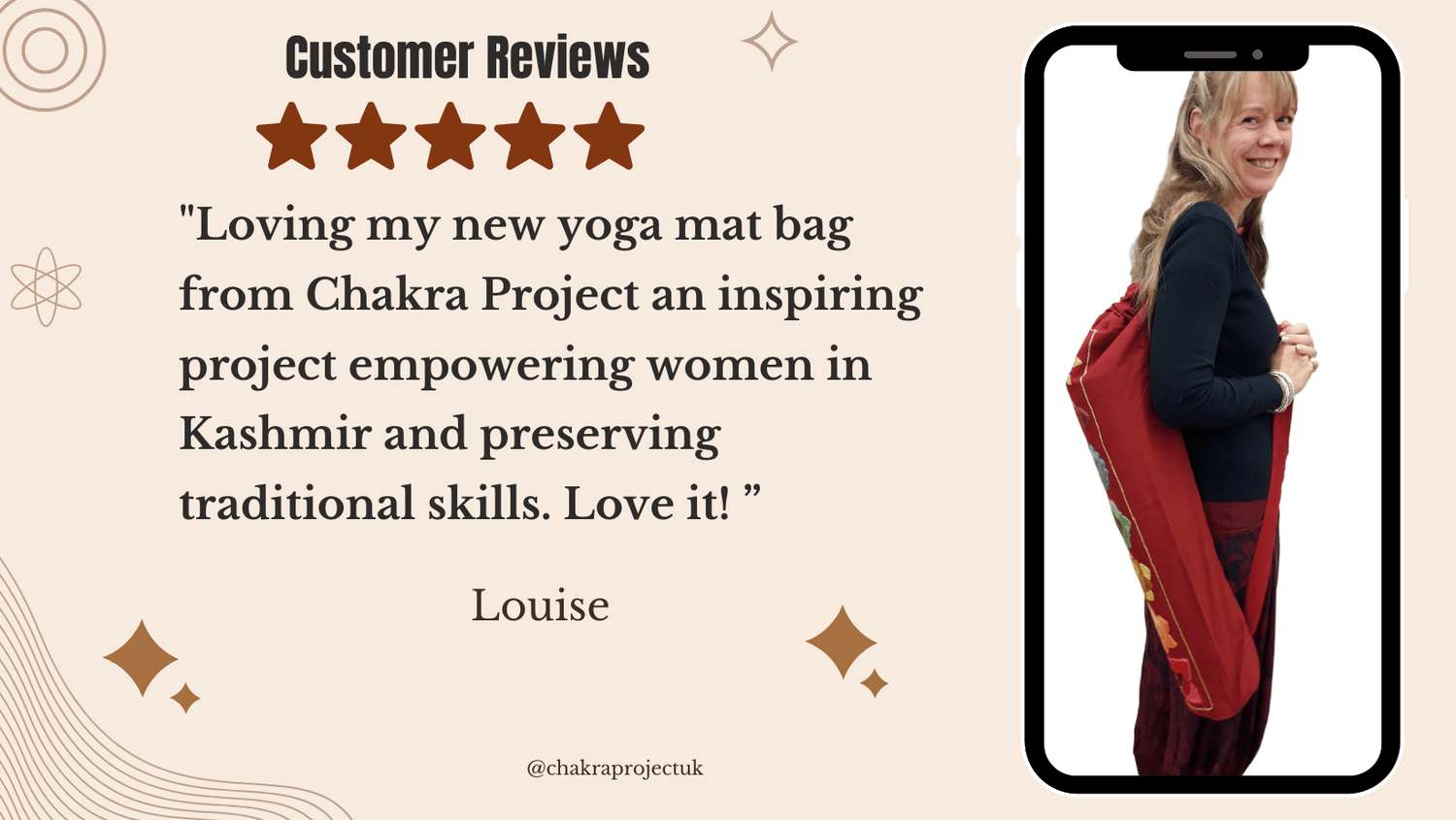 Make a difference through your Yoga Practice. When you choose Chakra Power – Chakra YOGA MAT BAG, you’re not just buying a product, you’re supporting a cause and driving a change. Your purchase makes a positive impact on the lives of the women in the mountains of the Himalayas in Kashmir and supports them in rebuilding their lives and preserving traditional skills. In conclusion, a Yoga mat bag is an essential accessory that offers protection, convenience, hygiene, organization, and a touch of personal style. Plus, with our CHAKRA POWER - CHAKRA YOGA MAT BAG, you’re also supporting a cause. Invest in a bag that complements your practice and carries the spirit of a warrior with every step you take.